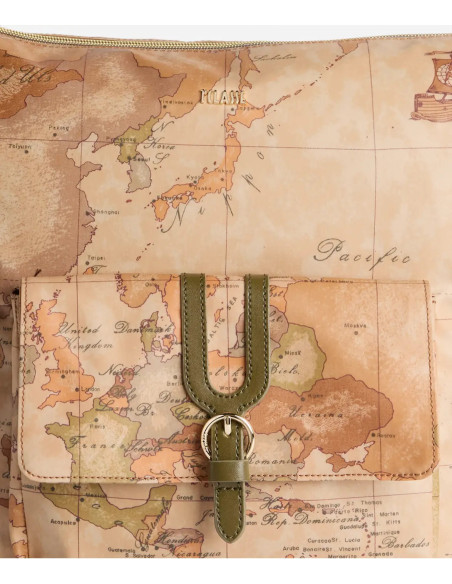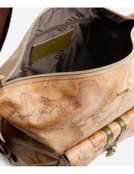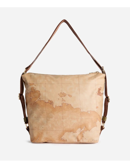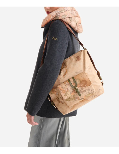 This Alviero Martini shopping bag, made of recycled nylon, is immediately recognizable thanks to the two handles with Geo Classic print and the 1C front logo.