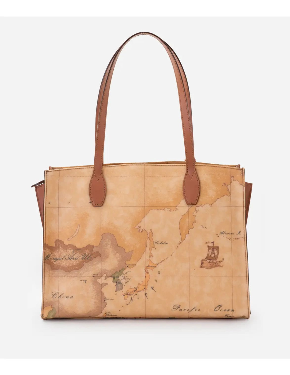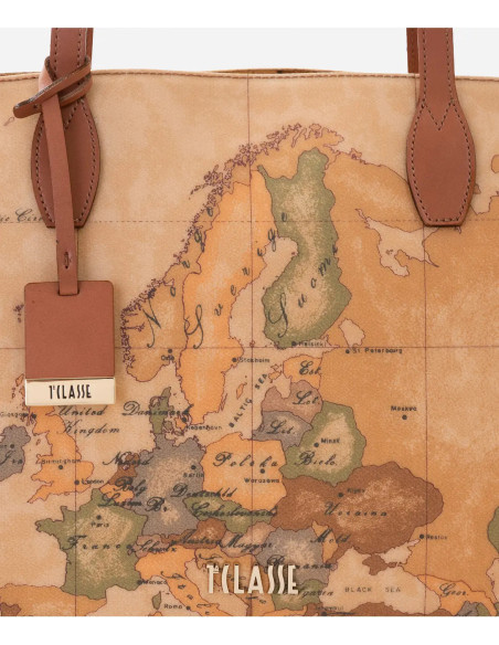 This Alviero Martini shopping bag, made of recycled nylon, is immediately recognizable thanks to the two handles with Geo Classic print and the 1C front logo.